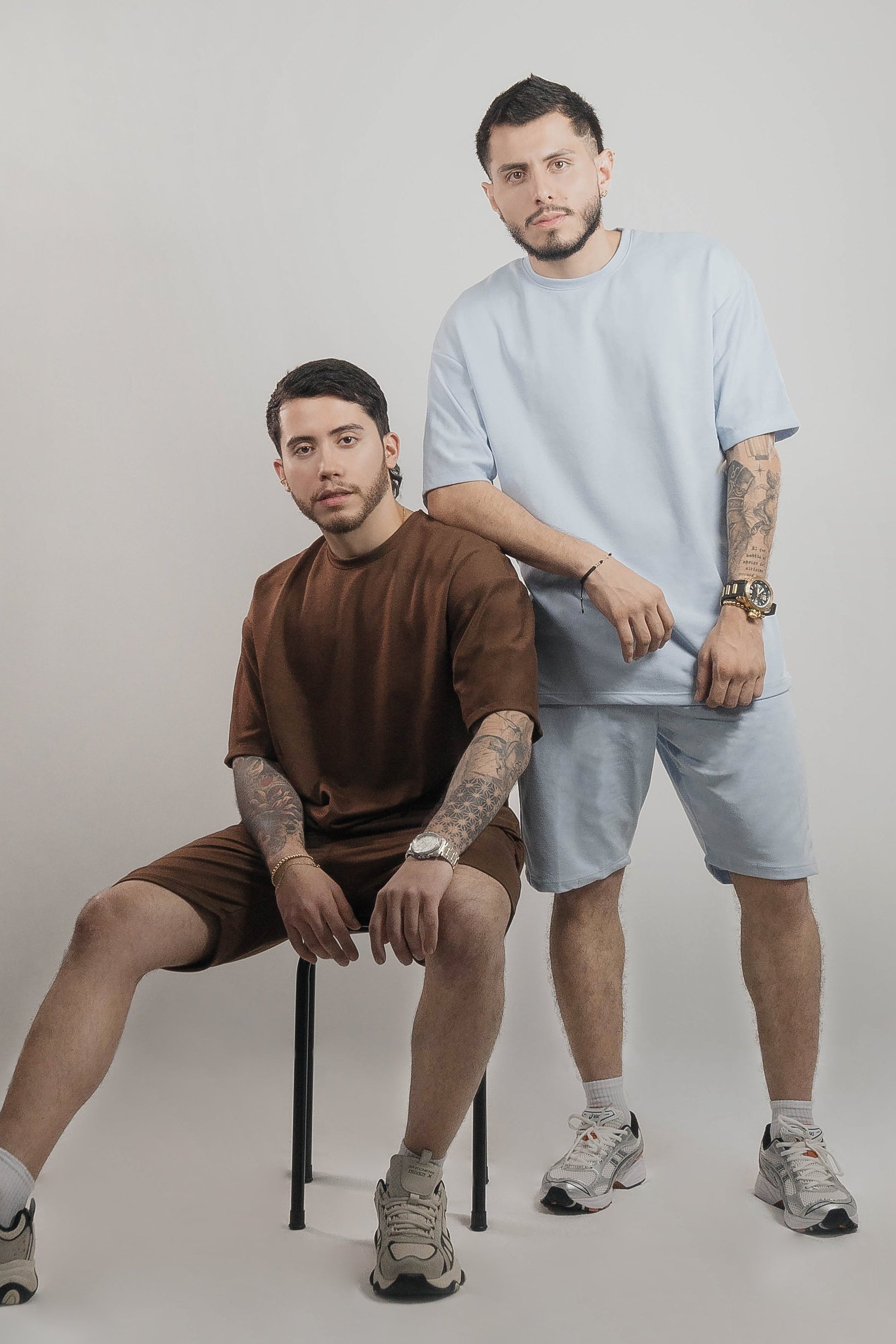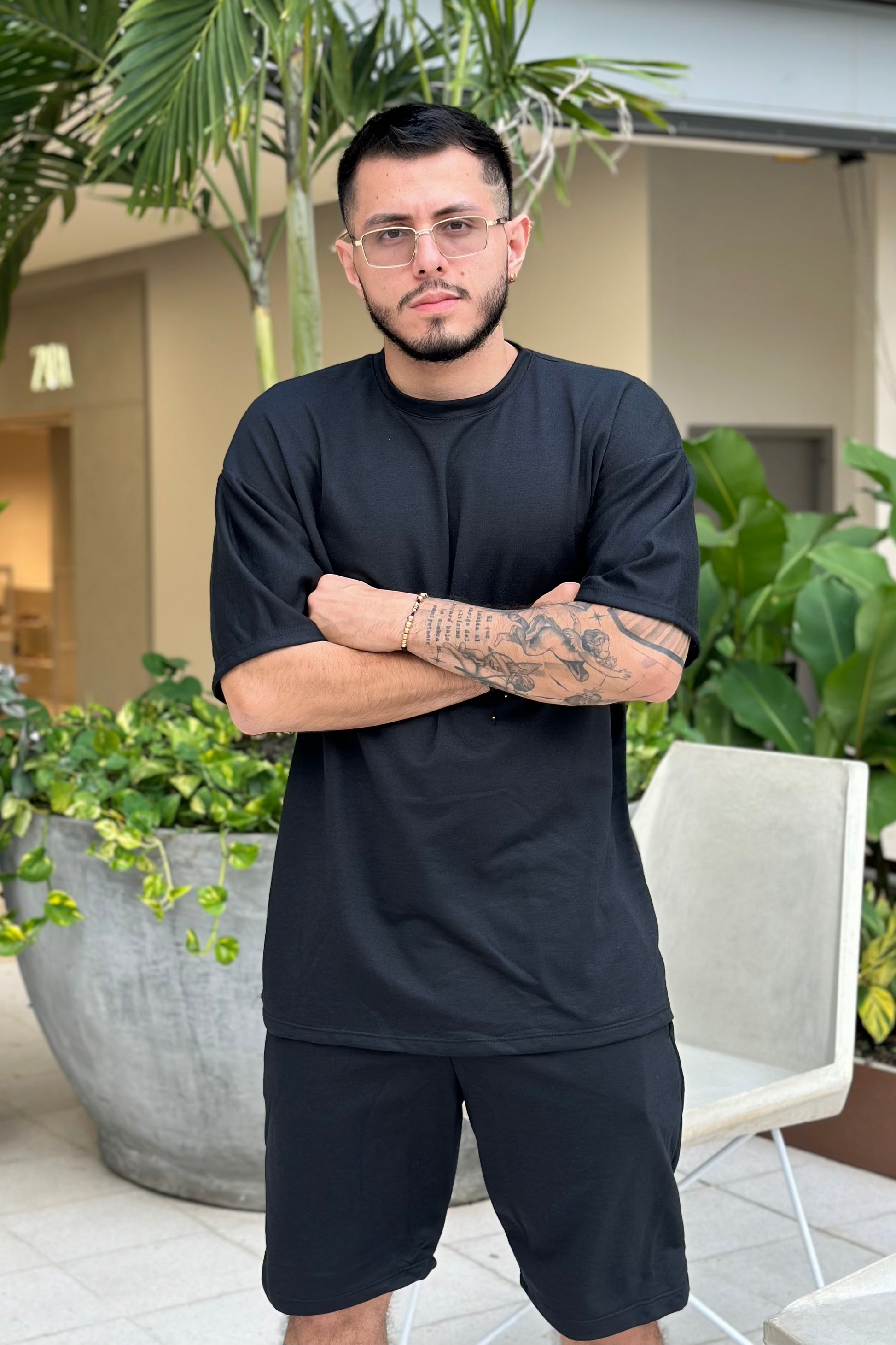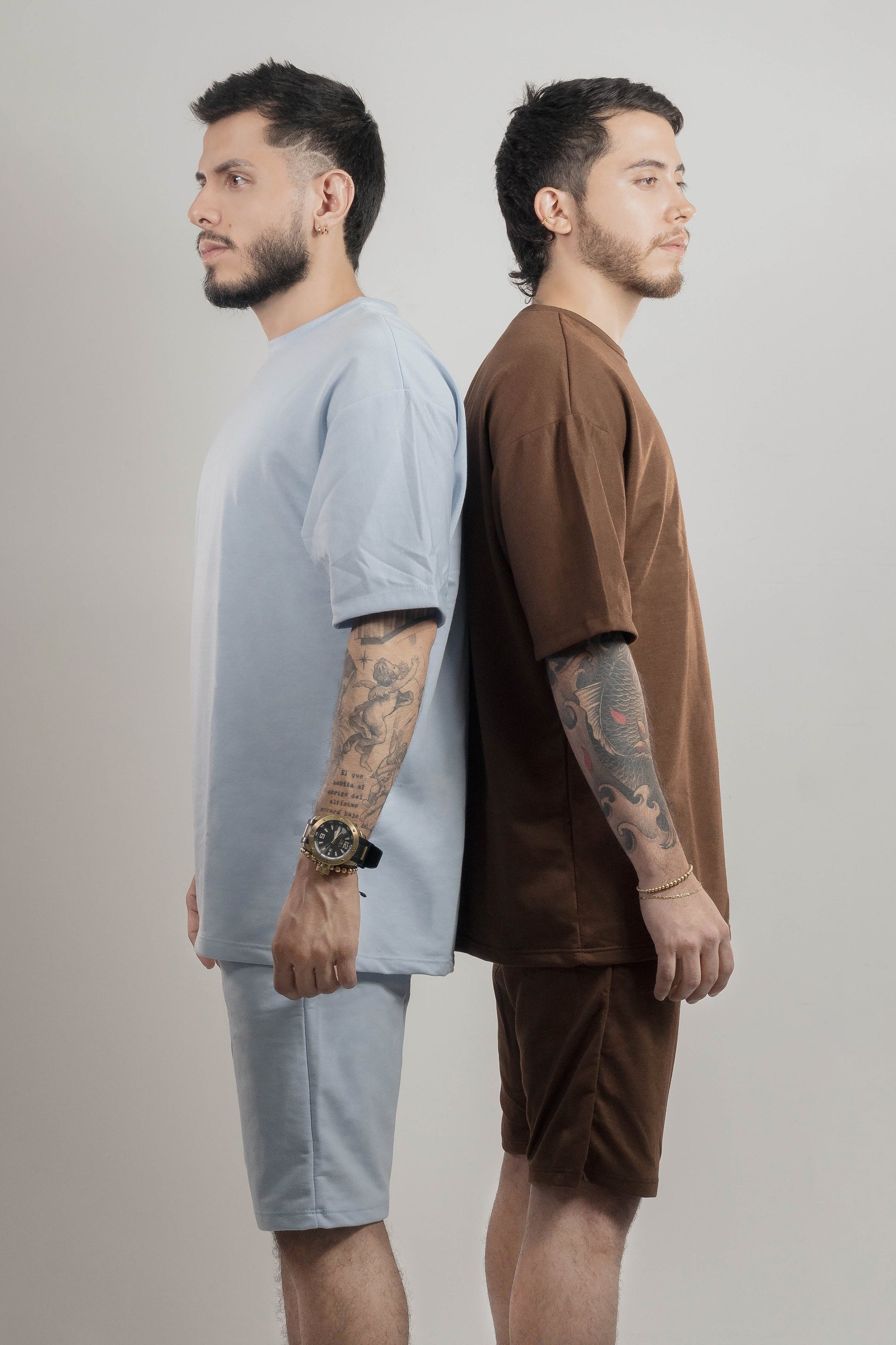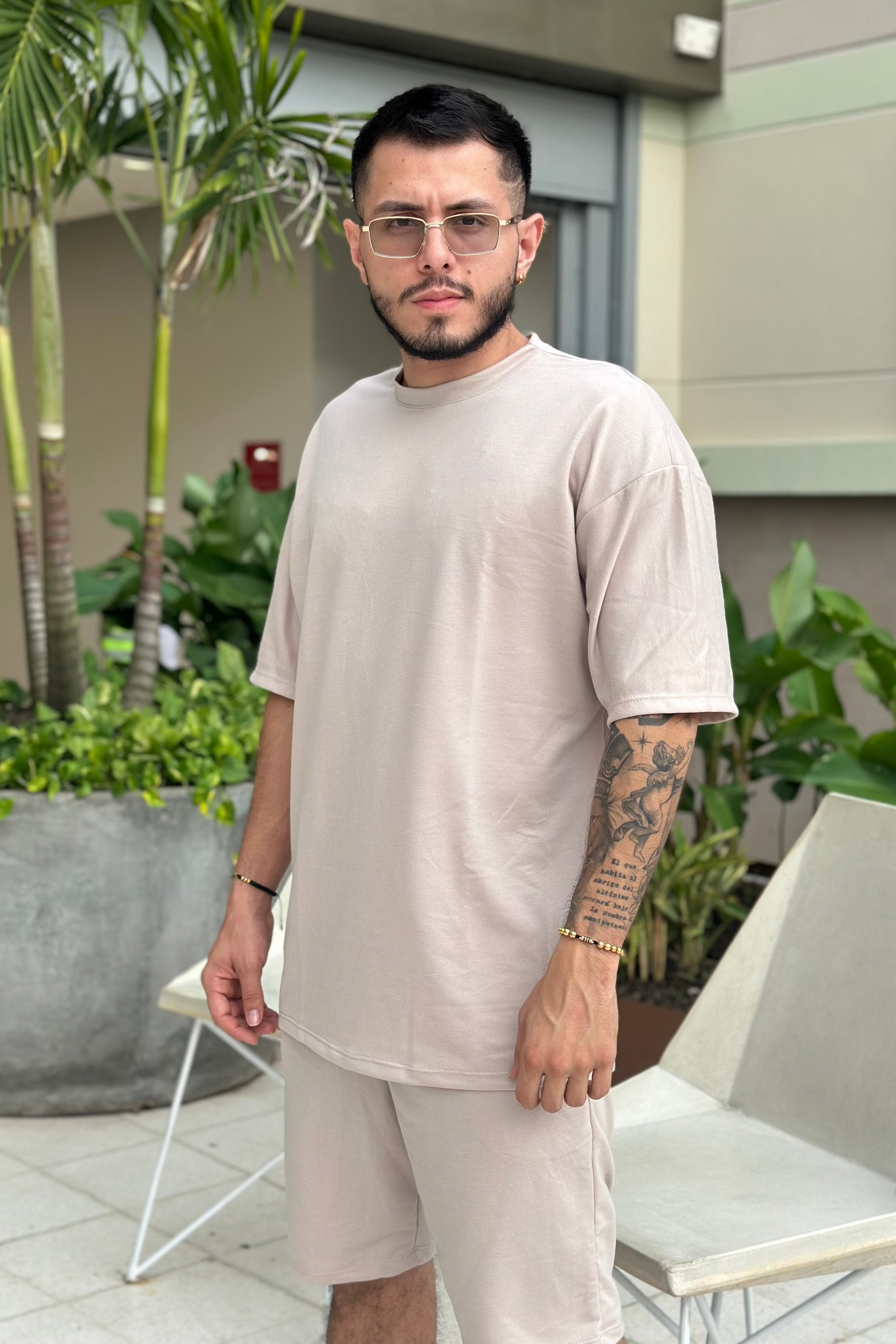 Camiseta oversize y pantaloneta de ajuste cómodo con cintura elástica. Disponible en una variedad de colores neutros.